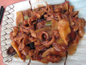 於是我們在周末常是三人行,到處去品嘗這些獨特的小吃。其中印象最深刻的就是『勝利』的海鮮米粉,一連去了好幾次。吃完後,我們再徒步到台北火車站搭公車去『故宮博物館』看特展,便是個完美的周末。當時『勝利』是台北少數的福州菜館中最有名的一家,菜做得很道地。福州米粉比台灣米粉稍微粗些,浸在甘甜的海鮮湯中,根根爽滑,而魚丸、蝦仁、蛤蜊、小卷、芹菜、花蟹組成了豐富的麵碼,鮮透齒頰。配著糖醋魷魚捲食用,相得益彰。糖醋魷魚捲酸甜適度,魷魚花刀切得漂亮,塊塊蜷曲如球,配料是炸酥的油條,又香又脆,從此對福州菜留下了難以磨滅的印象。
