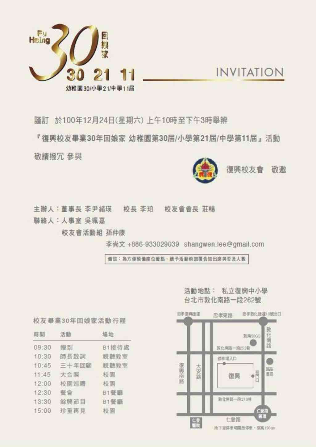 2011/12/24 是我們私立復興中學第十一屆畢業30年後回娘家的日子,誠摯地邀請您闔家返回學校團圓,參予這預計超過二百位師長同學的大聚會!